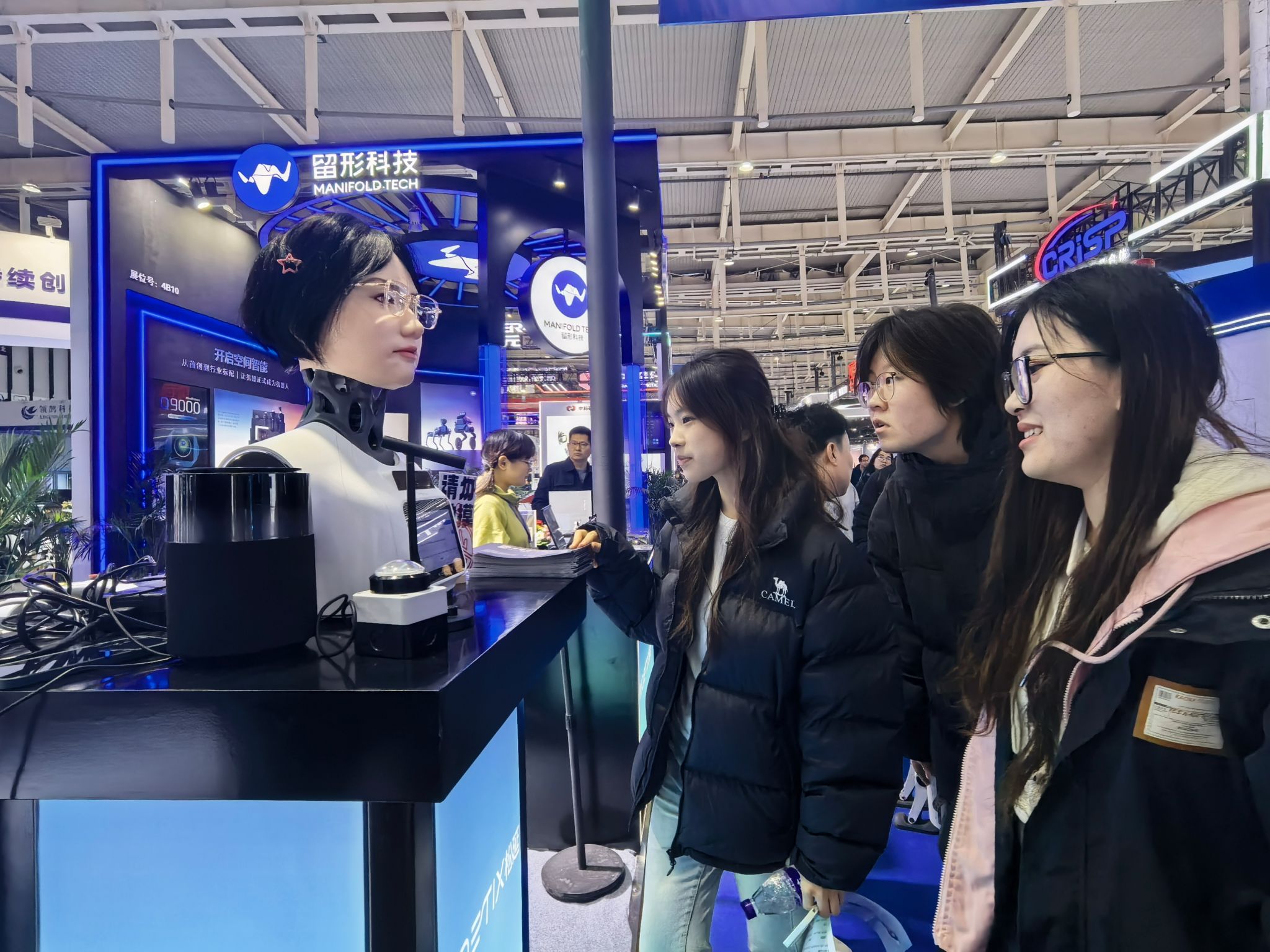 在展馆内,同学们带着浓厚的学习热情,依次参观了各个展区。从精准高效的工业机械臂协同作业演示,到基于大数据的智能生产调度系统;从人机交互的智能终端设备,到覆盖多行业的数字化转型解决方案,一件件尖端产品、一项项创新技术,让大家直观感受到智能制造为产业升级、社会发展带来的深刻变革。在重点企业展区,同学们认真聆听工作人员的讲解,详细询问技术原理、应用场景及行业发展趋势,并围绕专业知识与实际应用展开热烈讨论。