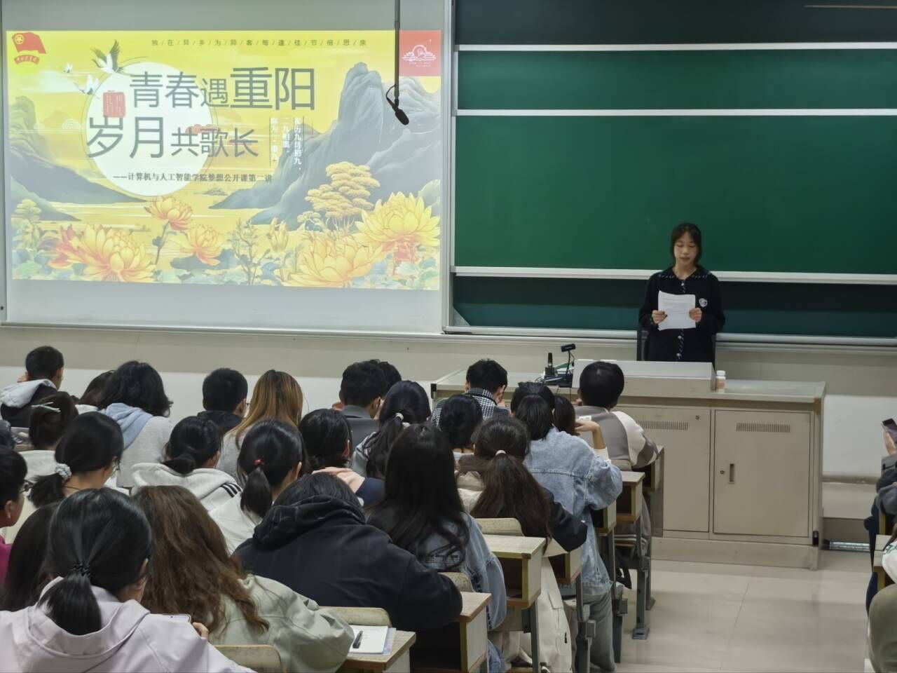活动在温馨融洽的氛围中拉开帷幕。主持人唐达娴同学以一段精彩的视频开场,将同学们从日常的团课学习引入到本次重阳节的特别主题中。生动的视频,配合主持人娓娓道来的讲述,迅速将现场同学带入到重阳佳节的文化情景当中。